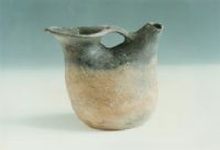 敝口,束颈,腹鼓,平底。流为袋状,和口部用一宽把相连,把面上近口处有二圆孔。素面。上半部呈黑色,下半部呈红色。