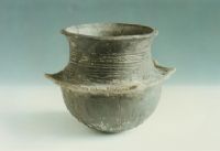 夹炭黑陶。方唇、敞口。六角腰沿,圜底。腹部刻划有粗细弦纹多道,腰沿沿面刻有繁缛的纹样,由点、线、圆圈组成,随每个角展开。底部为席纹