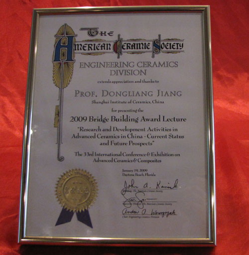 近日,美国陶瓷学会工程陶瓷分会授予中国工程院江东亮院士桥建奖(BridgeBuildingAward),这是该奖设立以来第一次授予中国材料科学家。2009年1月19—23日在美国佛罗里达州德塔纳海滩召开的第33届国际先进陶瓷及复合材料会议(33rdInternationalConference & Exhibition of AdvancedCeramics&Composites)上,美国陶瓷学会工程陶瓷分会授予江东亮院士桥建奖(BridgeBuildingAward)。该奖是专门授予国际著名材料科学家,每年一名,以表彰他们对世界先进工程陶瓷和陶瓷基复合材料等方面做出的杰出贡献。江东亮院士应邀在大会上作“R&DofAdvanced Ceramics Activities in China and Shanghai InstituteofCeramics Chinese Academy ofSciences”特邀报告。该报告介绍了中国和中国科学院上海硅酸盐研究所在先进陶瓷、陶瓷基复合材料、透明陶瓷、纳米介孔材料、生物材料以及制备科学等领域所取得的重要进展和贡献。由于受到签证延误,报告由董绍明研究员代为宣读并受到出席会议代表的广泛好评。出席本次会议的世界各国代表达1200余人。江东亮院士长期从事先进陶瓷及其复合材料的研究和发展工作,并做出了杰出贡献。他涉及的研究领域有微晶结构氧化铝陶瓷、氧化铝基金属陶瓷、高纯度氧化铝陶瓷、高强度碳化硅基陶瓷及其复合材料、SiC/Si3N4梯度和层状复合材料,并在水基流延成型和水基泥浆胶注成型领域颇有建树。目前江院士的研究兴趣集中在生物材料、透明陶瓷和纳米陶瓷复合材料等。江院士始终致力于国际陶瓷间的合作与发展。发表学术论文250余篇,出版著作3本,拥有专利18项,获主要奖项10余项,1993年被选为世界陶瓷科学院院士。