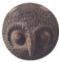 泥質红陶。呈半球形,塑成貓頭鷹頭部形状。頂部中心饰長喙,尖端内彎。喙两旁雙目圆睜,眼球凸出,眼框周圈刻锯齿紋一周。