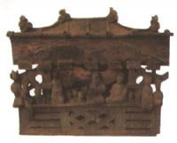 陶屋無殿顶,脊端有瓦當。柱下置欄板,由尋杖、蜀柱、卧欞、方格组成。簷额上繪红色垂幛,斗拱和欄板上繪红色及绿色斜方格。欄板上和欄板内,有撫琴、廳琴和嬉戲的男女及兒童。