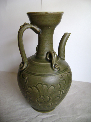 这件执壶高20.5厘米,口径7.5厘米,通体橄榄绿青釉,壶身刻有牡丹纹,做工精美。藏品持有人林先生有近10年的收藏经验,他告诉记者,这只壶是几年前他花几百元钱淘来的,“当时买的时候就很喜欢,也觉着这支壶非同一般,今天拿来请专家看一看,也检验一下我自己的识宝水平。”