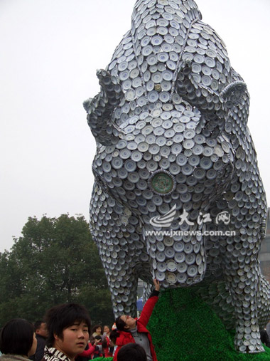 元宵佳节即将来临,在景德镇人民广场,一只由该市有关部门于日前制作的大瓷牛,引起了中外游人的注意,大家争先恐后地抢着与大瓷牛合影留念。据悉,这只大瓷牛是用上万块青花瓷盘搭制而成,被誉为目前世界上最大的青花瓷牛。