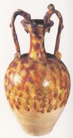 盤口,细颈,豐肩,鼓腹,下腹斜收,平底。兩侧各置一螭形耳,兩螭首伸向瓶口。灰白胎。盤口内外及器壁施黄、褐、绿三彩釉,呈斑點状。釉不到底。