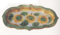 八曲海棠花式,宽折邊,浅腹,平底。盤口飾卷草紋,盤内印盛開的折枝菊花,按花加凃黄、绿、白三色釉,白地、黄花、綠葉,色彩鲜明均匀,光艷潤澤。浅红色胎,施三彩釉,有細開片纹。