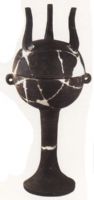 夾砂红陶,外表全部磨光,呈深黑色。半球形盖,上有三個等距離的八棱形立鈕,上细下粗。器口内斂,斜平唇,深弧腹,腹兩侧各有一環形耳,细高柄,喇叭形圈足。豆身及柄饰輪質凹弦纹,圈足上刻劃勾連雷紋。蓋面從中心至邊緣刻劃四層花紋。