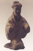 泥質灰陶,外敷白色陶衣,上施黑红彩。女俑髪分中缝,身穿雙领深衣,雙臂前伸,跪坐於地,應為侍俑。