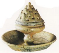 泥質红陶。爐的下部為圆形承盤,盤中心有一短柄,上接斂口鉢形爐身,爐盖呈圆錐形,有鏤孔,以便香氣散出。