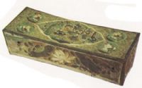 枕呈長方形,中間略束腰。枕面中央有菱形開光,内繪聽琴圖,四角有圆形開光,內繪婴戲圖,内容分别為采蓮、傀儡戲、釣魚等。枕壁前後個面刻劃蓮葉蓮花,左右兩侧面為牡丹紋。