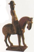 馬上坐一仕女,頭戴遮陽帽,樱口朱唇,面容秀麗,上身穿窄袖白衫,外罩白褥衣,上繪紅色碎花,下穿黄色百褶裙,足蹬黑色尖頭鞋。右手持韁,左手下垂。馬身為黄色,臀部有紅斑。馬具齊全,立於長方座上。