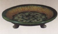 敞口,宽平沿,圆唇,浅腹,平底,下設三個馬蹄足。盤內底中心以绿色釉為地,上繪彩色飛雁及彩雲,外壁施黄釉。