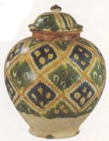 此盖罐腹部主题纹饰為褐色菱形紋,每一菱形内用白色圆圈纹圍成邊框,内繪蓝地或綠地黄、白小花纹。彩釉施不到底。胎呈白色,釉彩斑驳艷麗。