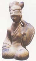 泥質灰陶。俑為跪姿。頭梳高髻,雙目平視,面带笑意。上身内穿中衣,外罩禅衣。右手下垂,置於右腿上,左手撫耳後部。塑像安静恬淡,似已陶醉在美妙的琴聲里。