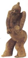 泥質灰陶。頭戴旋鈕软帽,雙目微睁,舌頭外吐,聳肩縮頭。右手執鼓槌,左手持鼓,正欲敲擊。挺胸凸腹,臀部後翘,雙腿微曲,右腿前伸,左腿靠後,用以支撐身體。