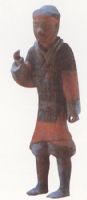 泥質灰陶。俑施以紅、黑、白色彩繪。身穿黑色鎧甲,腿部絮行縢,右手前舉,左手下垂,左手有插孔。背後有方形箭囊,其上有插箭孔。