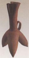 细質红陶。直口,圆唇,口處有管状流,舆口相隔,细長颈,腹部高開襠,下設三長袋足。頸和袋足之間饰有带状橋形鋬手。
