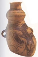 泥質陶。壺體作鸭形,口颈為鸭頭,腹部為鴨身,兩侧有環形耳,後部有短尾。通體用黑、红兩彩繪有鴨纹、水波纹。
