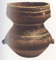 泥質紅陶,斂口,平沿,束腰,鼓腹,平底。上腹兩侧有對稱豎鼻,下腹中部置豎耳一對。器身施黑白彩,白彩繪平行線,黑彩則繪網格纹和圆點纹。