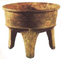 夾砂红陶。器呈盆形,侈口,口沿外折,腹壁近直,圜底,下腹接三鸭嘴形足。腹部刻劃弦纹裝饰,中間有一道凸起的繩索紋,足上部刻劃下垂的線紋。此器出自遗址文化層中,且周圍土面有灼烧跡象,此器應為飲具。