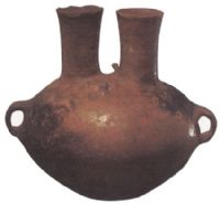 夾砂紅陶。通體光素無纹。雙直口,扁圆腹,平底。肩兩侧有一對穿鈕,腹兩侧有對稱弧形耳。此器造型别致獨特,带有濃厚的地方特色。陶質以砂質褐陶和泥質红陶為主,器型有大口深腹罐、直口碗、筒形器和大口钵等,均為手制。