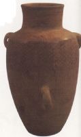 泥質红陶。侈口,粗颈,平肩,鼓腹,平底。一侧上腹部饰對稱環耳,另一侧下腹部饰一较大的環耳。器身紅褐彩繪同心半圆紋、斜方格網纹等。此器設計合理,繫繩汲水、背负提挈均较方便,是大汶口文化最具特點的器物之一。