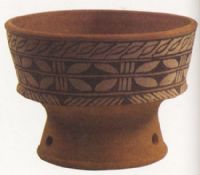 泥質红陶。斂口,深腹,喇叭形高圈足,上鏤空三個小圆孔。腹部凃白色為地,上飾黑彩繪成的樹葉紋及三道弦纹。    l