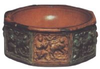 盤呈八角柱形,外壁各面印人戲狮紋,人物形象為西亚人,施黄、褐、绿釉。此器造型规整,釉彩艷麗,紋饰精美别致,立體感强,顯示出遼代三彩烧制技術的高超水平。