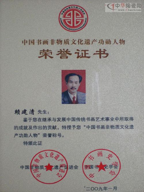 2009年1月20-22日,中国书画非物质文化遗产大会于全国人大会议中心会议厅隆重举行。此次大会由国家文化部中国非物质文化遗产促进会等主办,邀请全国参会代表120位。当代实力派书画艺术家赖建清受邀,并被授予“中国书画非物质文化遗产功勋人物”荣誉称号。期间,他还在北京大学举行的“2009年中国书画艺术高峰论坛”上作二十分钟的专题演讲。