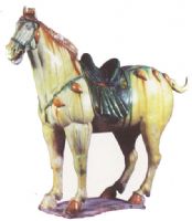 馬昂首直立於長方形踏板上,兩耳直豎,雙目圆睜,張口嘶鳴,剪髻缚尾,辔饰,背披花毯,前腿直立,後腿微彎。馬身施白釉地,間饰禄、黄等彩釉。此器造型生動優美,神態逼真,體魄雄壮威武,姿態矯健。三彩釉自然垂流。