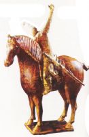 馬四肢直立於長方形底板上,披髻缚尾,馬鞍上坐一武士,頭带襆頭,侧身回首仰望天空,雙手作张弓搭箭的射放状,腰間褂一長劍。馬身和人身均傒绞胎,胎呈白色,外罩彩釉,色彩艷麗,絢爛斑驳。绞胎在三彩器中较為罕見,工藝難度大,表现出唐代陶器製作水平之高超。