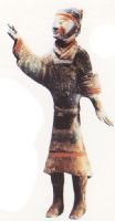 泥質灰陶。此俑呈站立状,頭部微昂,面微向右,五官端正,頭戴方巾,身穿戰袍盔甲,腰繫革带。右臂高舉,手指向前方,左手向下斜伸,足穿長靴。全身施紅、綠、白、黑等彩繪。