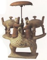 泥質灰陶。展翅承载朱繪鼎,背部站立三人。兩個身穿紅袍,拱手而立。漢代人把鵨視作吉祥之鳥,满鼎美食,供入食用,可以長生不老。