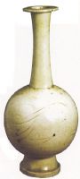 宽平唇,细長頸,球形腹,高圈足外撇。腹部有刻劃花装饰。白釉微閃黄色,積釉處隐现黄绿色,胎薄坚硬。此瓶應為定窰制品。定窰白瓷為宋代白瓷之冠,並以豐富多彩的装饰花纹取勝,其装饰紋樣嚴謹整齐。