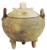 斂口,圆鼓腹,平底,下設三個柱状足,近口沿處設一對環形耳,配笠帽状盖。