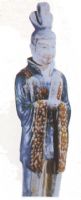 胎呈白色。此俑恭立於方座上。頭戴黑色梁冠,長方大臉,五官端正,面带微笑。身着白色長襦衣,外套綠色宽袖短袍,袖饰宽邊黃、白花斑。足登翹頭靴,雙手執牙笏拱於胸前。