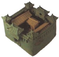 泥質陶。城堡呈立方體形状,四周築有高牆,牆上鏤孔棱格式窗。上有四阿顶式門樓,四周設角鏤。前後大门各有文吏和一武士守衛。城堡内有長方形房屋兩幢,其中一是二層閣樓,設有楼梯,左侧有一厕所。屋内塑有數人,有的端坐,有的為跪姿,刻劃精細,神態各異。
