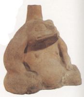 泥質灰陶。器形為蛙首人身,雙目圆睁,袒胸露腹,背部置一圆柱形插孔。東漢墓葬出土,為随葬明器。
