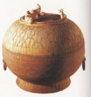 泥質陶。盒呈扁球形,蓋顶堆塑三羊。通體刻劃羽毛紋、菱形紋、劃齿紋等,外罩以薄釉,胎質坚硬。此器造型渾圆饱满,採用堆塑、刻劃的装饰技法,紋饰仿同期青铜器的圖案,具有鮮明的地域特徵。