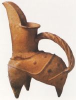 胎中夾砂。手工塑制,施有黄陶衣,壓磨光滑。岛啄形流向上斜伸,直筒形頸,三袋足分襠而立。前兩足作封稱狀,後足特别肥大且向後伸,三足位置呈等腰三角形。頸下兩侧饰附耳,袋足上饰曲綫状附加堆纹,遍身贴附小圆饼饰。