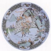 敞口,圆唇,弧壁,浅腹,圈足。盤内口沿锦地网光內饰折枝花卉,中心繪五彩人物故事圖案。