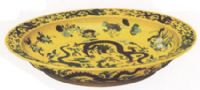 折沿,曲腹,圈足。折沿上繪彩雲中的 神龍,在奮力追逐火球。盤內腹繪有梅花,菊花,牡丹花,花繁葉茂,梳密有致。黃地,白花,紫花,綠葉,色調溫潤鮮艷,絢麗工巧。