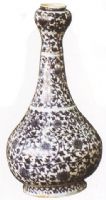 胎體厚重,修胎粗糙,接痕明類。蒜頭口,粗長頸,圆腹,宽圆矮圈足,砂底。釉色白中閃青,釉層稀薄。通體繪缠枝莲,釉層濃重外带有明顯的凸起的黑色斑點。