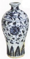 此瓶以缠枝莲為主题紋,配以蕉蕖和折枝果,是典型明代空白期風格。此瓶青花呈色纯藍不艶,造型端莊,  胎質潔白细腻  為空白期民窑的代表作。