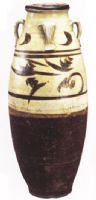 圆口,捲唇,長圆腹,平底微內凹,近口處附四扁带形繫。施白釉至腹中部,並用褐彩繪草葉紋,風格粗狂,寫意生勤。