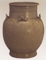 直口,溜肩,瓜楞形腹,圈足,平頂蓋,盖頂和颈部有弦纹装饰,肩部置四穿带鈕。釉色泛黃。此罐雖很完整,但釉面土蝕較重。