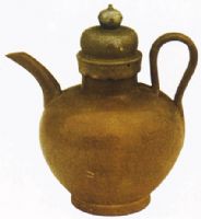 直口,豐肩,球形腹,圈足微外撇,長流略有弧度,高曲柄,有盖。器身為四组纏枝團花舆折枝花案,肩部饰一圈卷葉纹,颈部、柄、流飾雲纹,器蓋饰雲纹和羽状纹。此器造型完美,釉色熒潤似玉,為越窰瓷器中部多見的精品,惟蓋部有殘損。