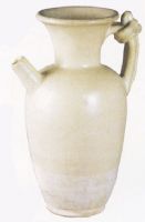 侈口,束腰,圓肩,圓腹,管狀流,頸肩之間有一曲柄,柄上附一圓頭形裝飾。白釉,質細且堅,施多半截釉,釉色白中泛黃。此壺為定窰產品。