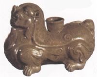 器呈獸形蹲坐状,背設管狀進水口。獸的造型颇似狮子,體肥硕,中空,用以聍水。全身刻劃直線鬃毛,在鬃毛邊缘及四肢饰卷霎纹,尾部饰葉叙。灰白胎,胎質较粗,青灰色釉,有细碎開片。此器是南方青瓷窑的產品,出土於北方地區。