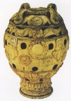 小口,鼓腹,圈足略外侈。通體贴花,肩、腹饰獸首和荷葉组成的團花及缠枝蓮花装饰纹带,有三角形、月牙形、圆形鏤孔,纹饰繁缛華麗。肩置四個粗壮的複式繫,圈足,表面饰覆蓮纹。通體施白釉,釉層薄而滋润,釉厚處微泛青。此尊尤為特別的是,器物內中有一瞻,是一件奇特罕見的文物。