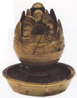 盖峰山重叠狀,分為三層,每層五峰,交錯排列,峰後有十個鏤孔,為出煙用,圆頂上附蘑菇鈕,下為折沿平底承盤。胎為灰白色,捏外滿釉,釉色熒潤,呈青綠色。整體造型似大海中托起的山石,底盤則象徵大海。此器造型造型飽滿挺立,釉色熒潤均凈。出土時略殘。